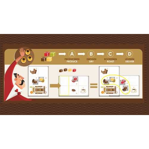 Die Spieler geben Aktionspunkte aus, um Kaffee anzubauen, zu trocknen, zu rösten und schließlich an Kaffeehäuser zu verteilen oder an ihr Lager zu liefern.